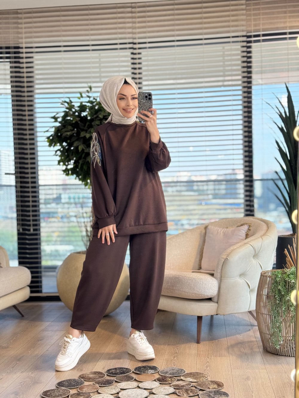 24361 Sol Omzu Boncuk İşli Tunik Kahve