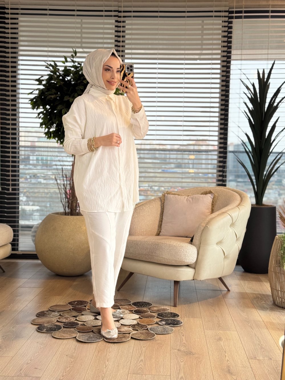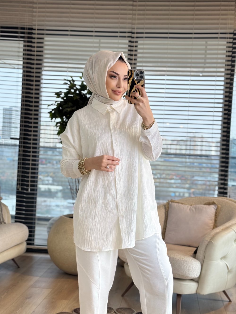 2490 Kendinden Desenli Gömlek Ekru