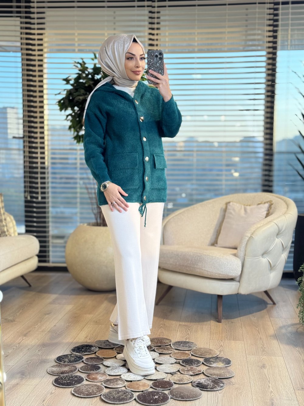 2502 Saçak Kapşonlu Çıtçıtlı Hırka Zümrüt