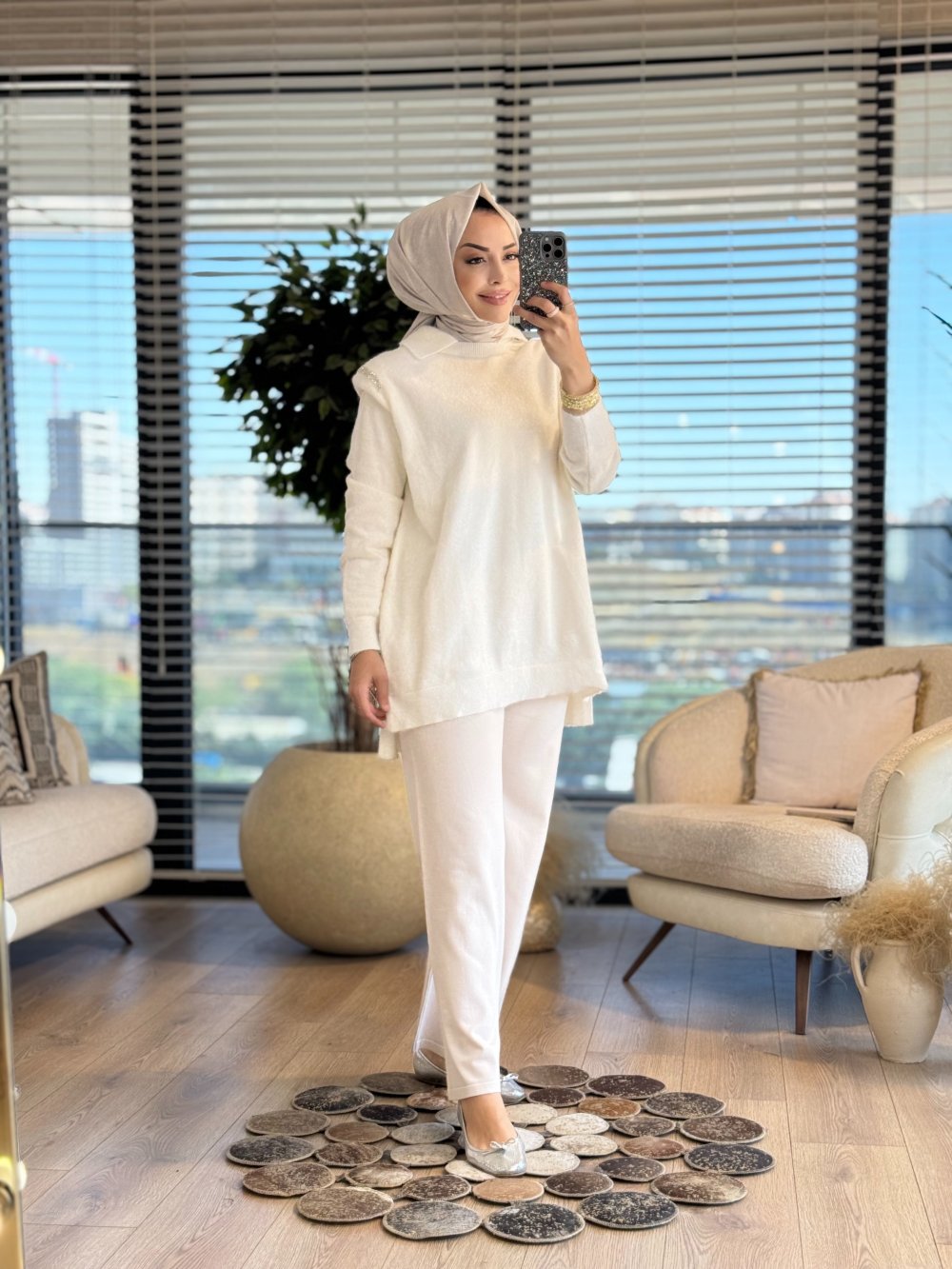 25036 Angora Omuzları Taşlı Tunik Ekru