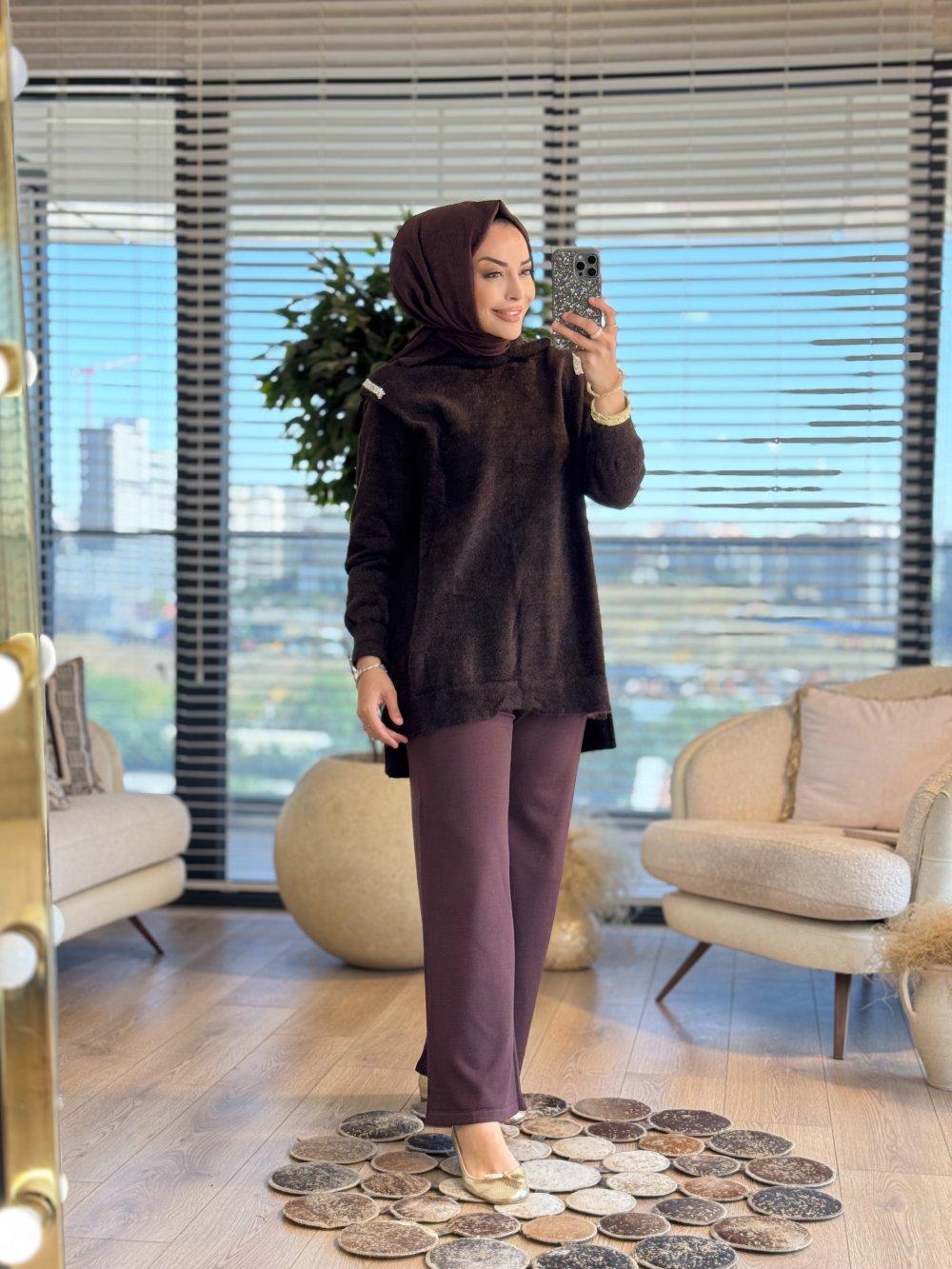 25036 Angora Omuzları Taşlı Tunik Kahve