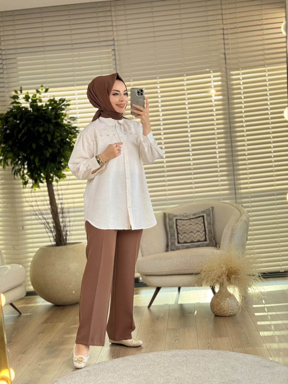 2507 Taş Ve İnci İşlemeli Keten Gömlek Bej