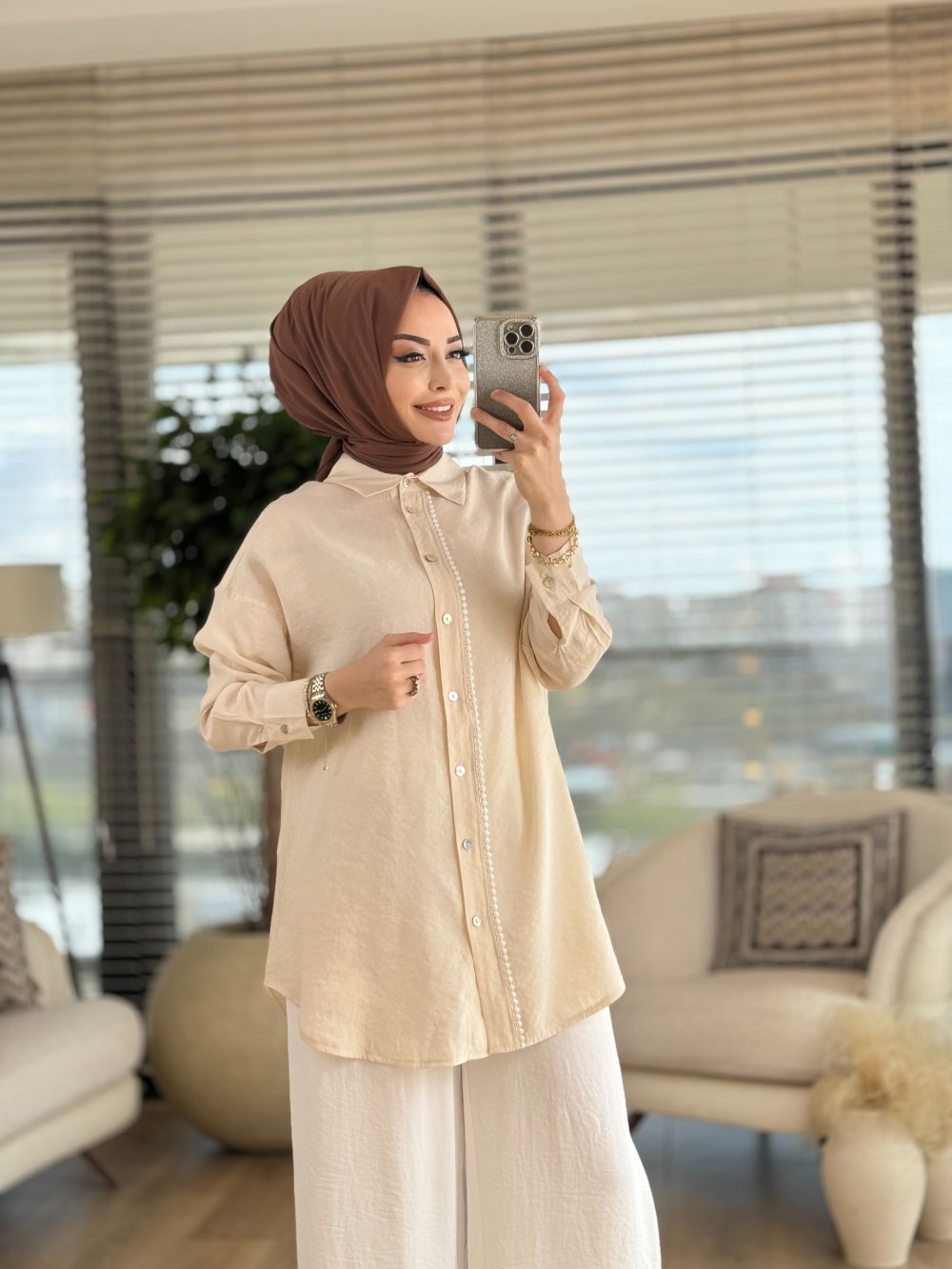 2543 Patı Brode Şeritli Şeritli Gömlek Bej