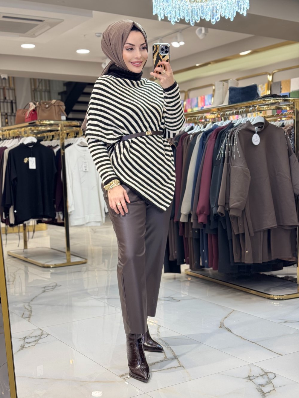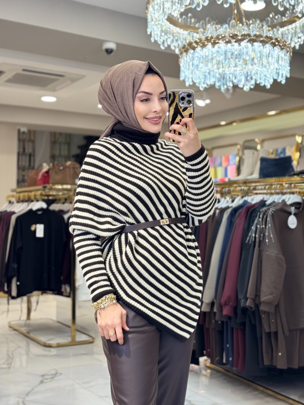 2589 Çizgili Asimetrik Triko Tunik Kahve