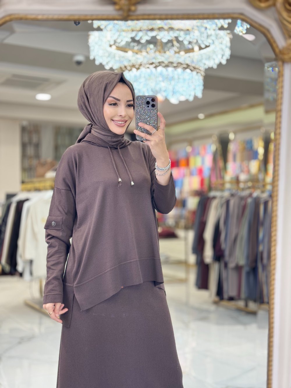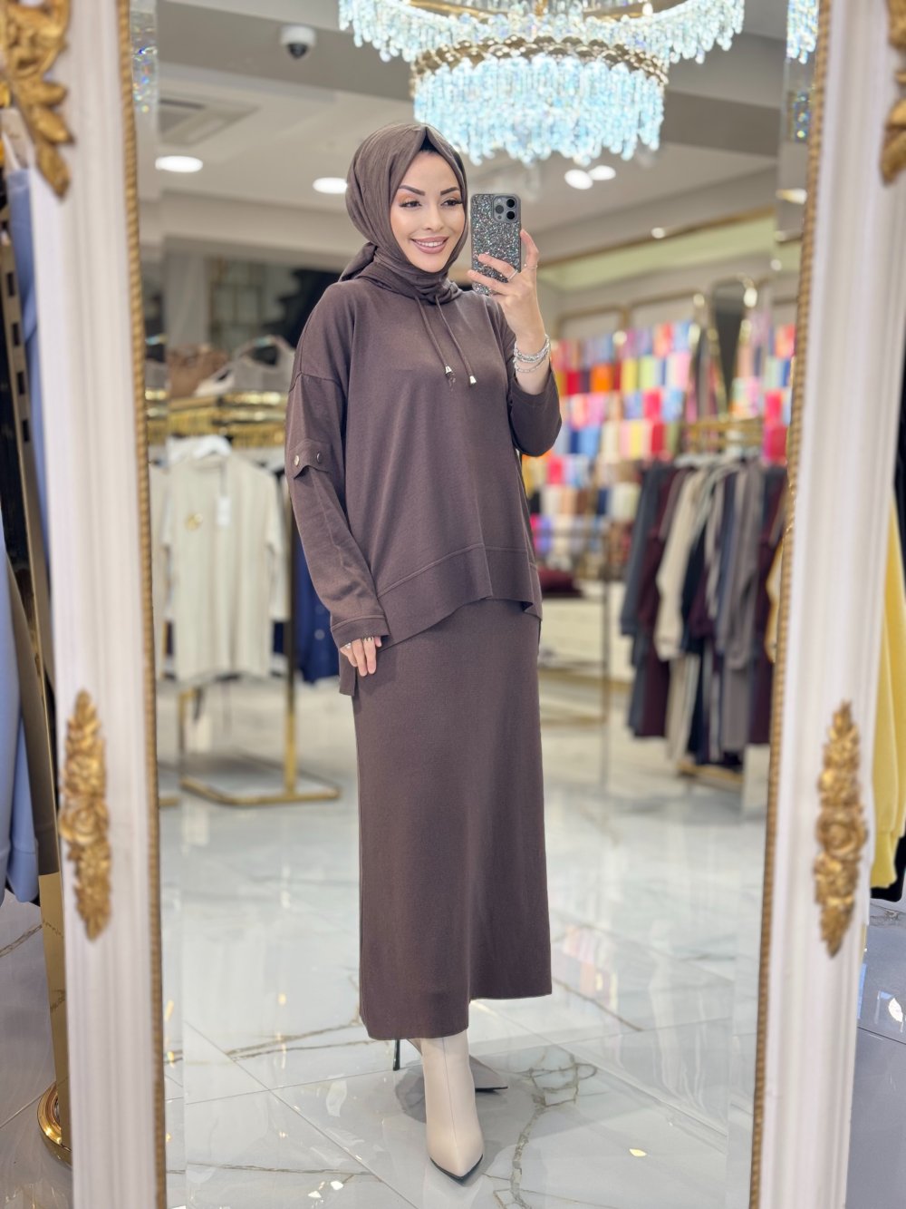 2597 Kapşonlu Etekli Triko Takım Kahve