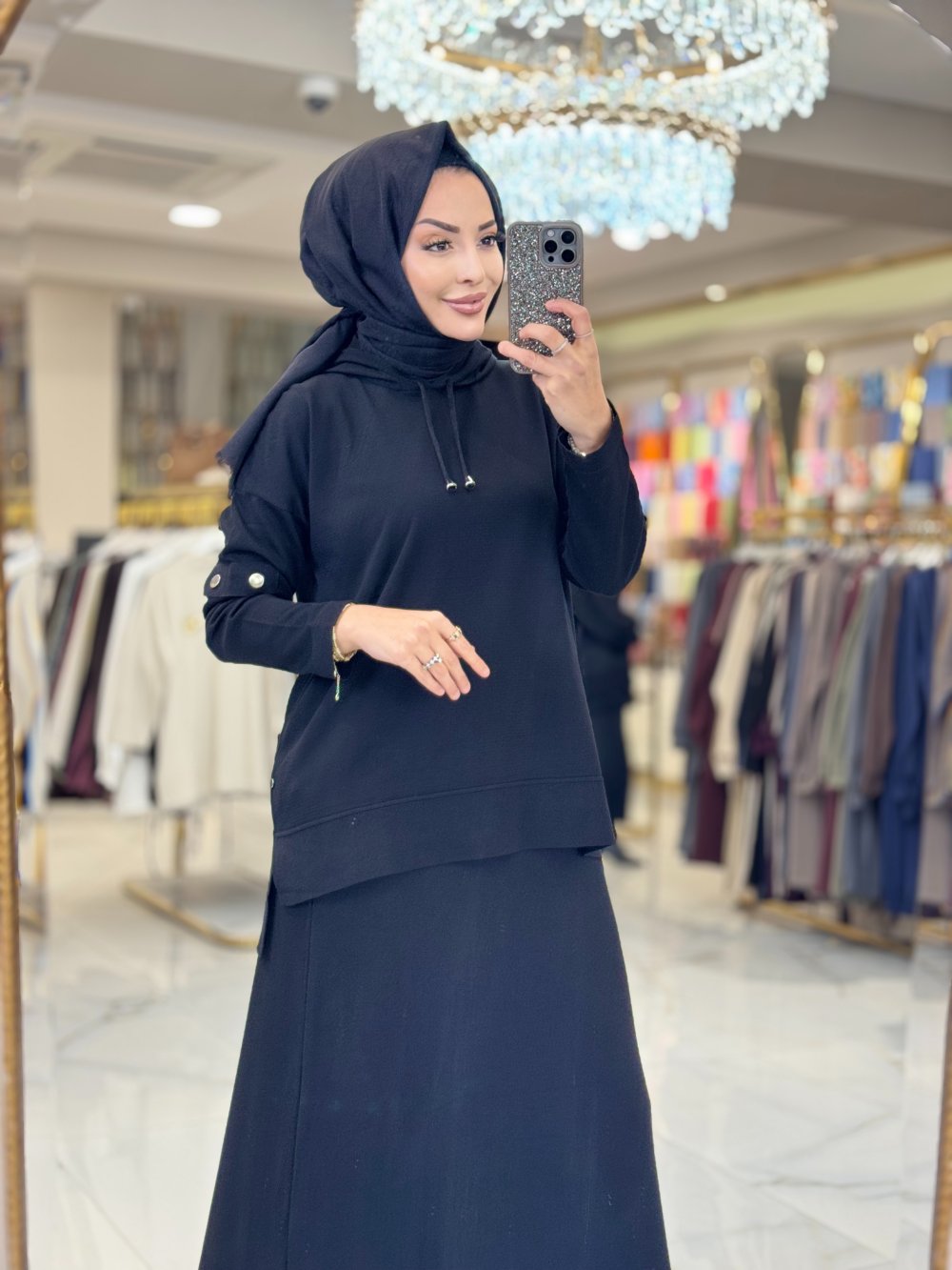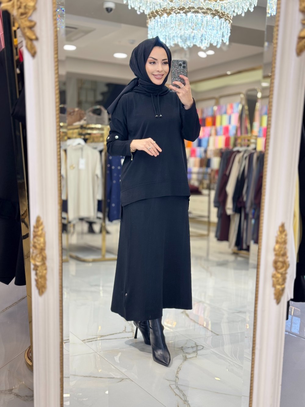 2597 Kapşonlu Etekli Triko Takım Siyah