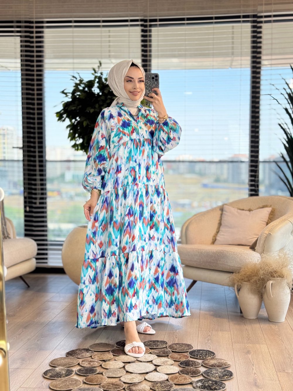 25EL296 Suluboya Desen Elbise Turkuaz