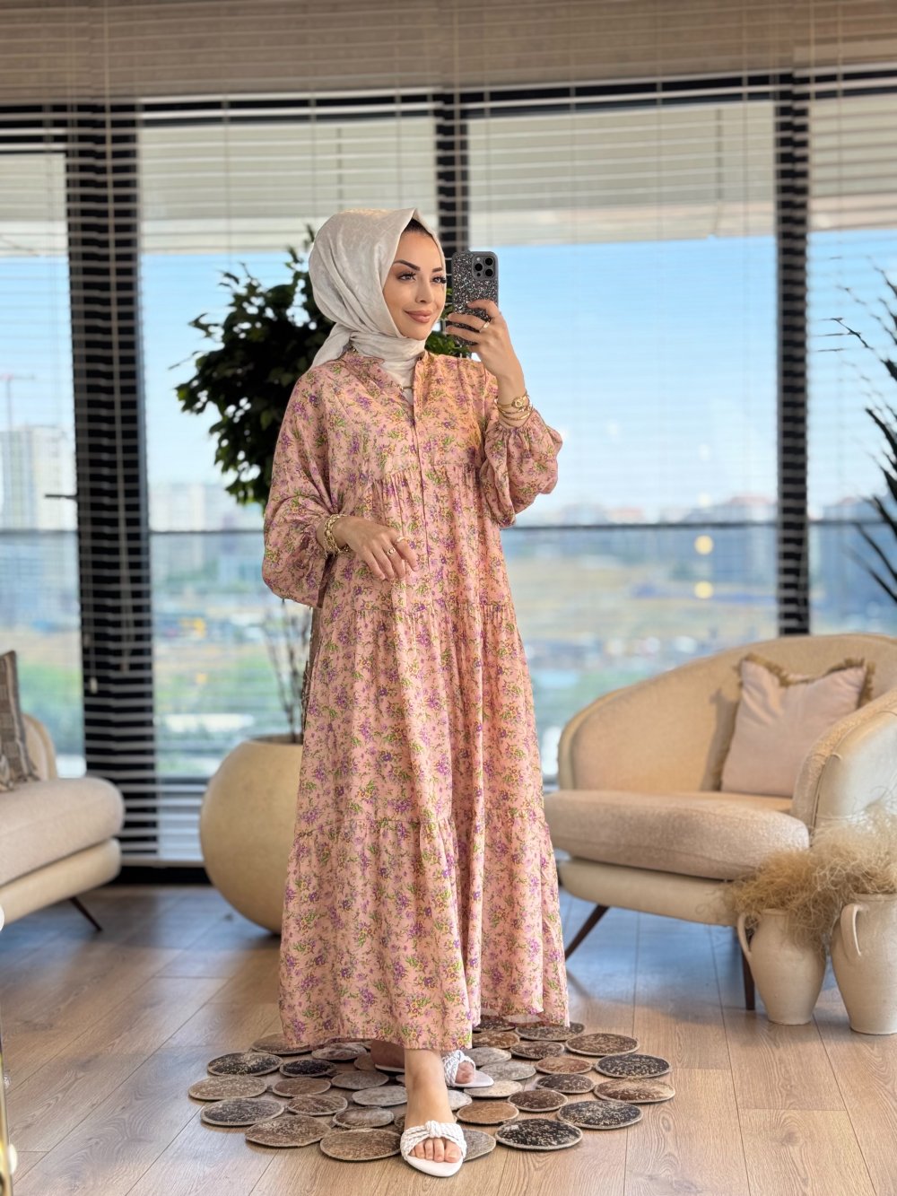 25EL534 Çiçek Desenli V Yaka Elbise Pudra