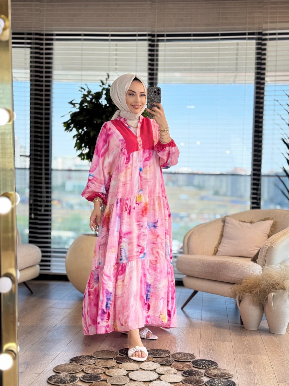 25EL542 Batik Desen Yaka Düz Elbise Fuşya