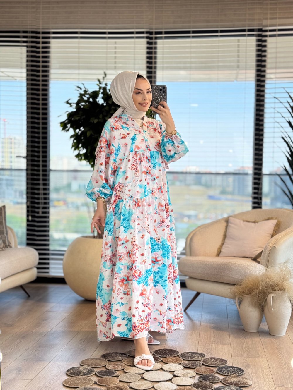 25EL560 Renkli Batık Desen Elbise Turkuaz