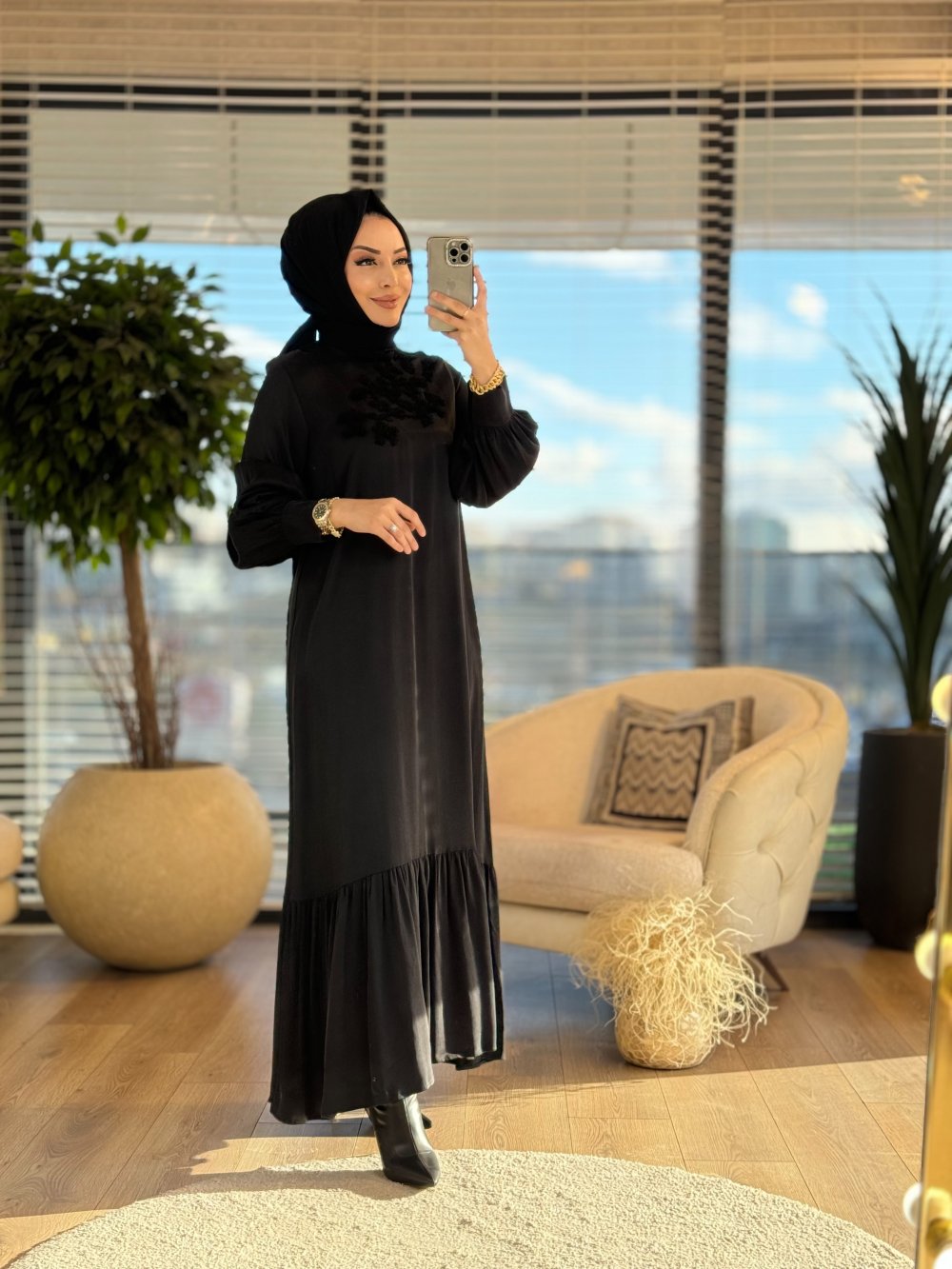25K2008 Önü Saçak Kabartma Desen Elbise Siyah