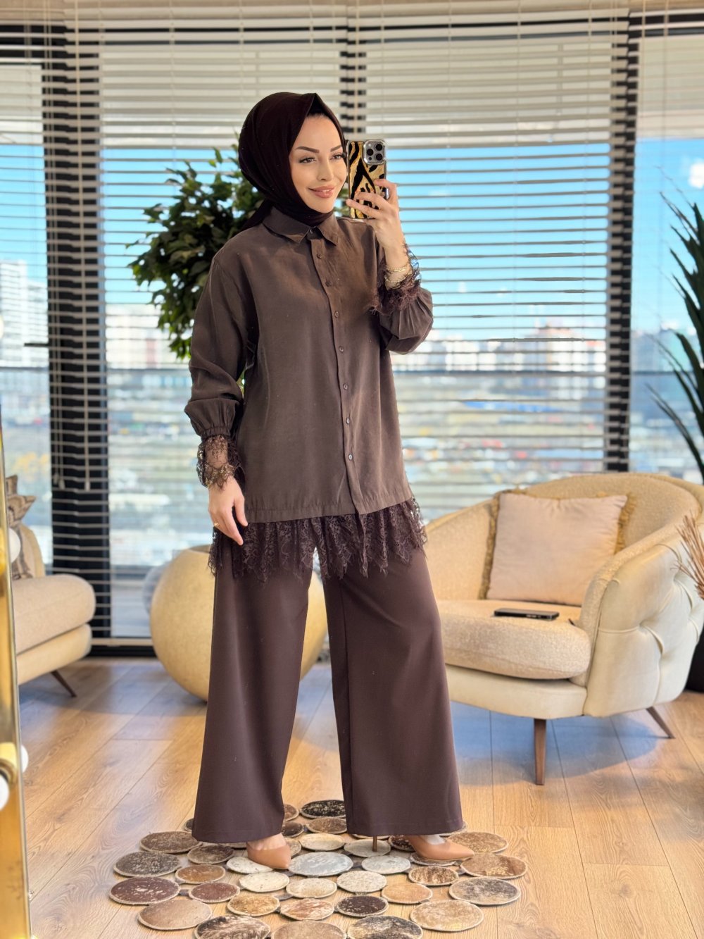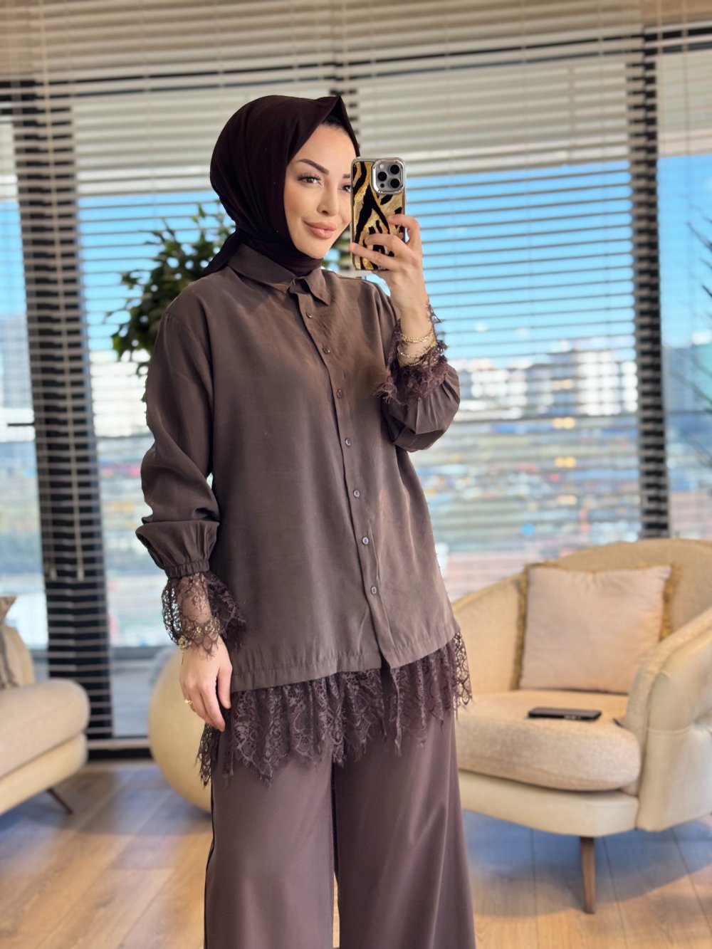 260124 Şık Dantel Detaylı Gömlek Kahve