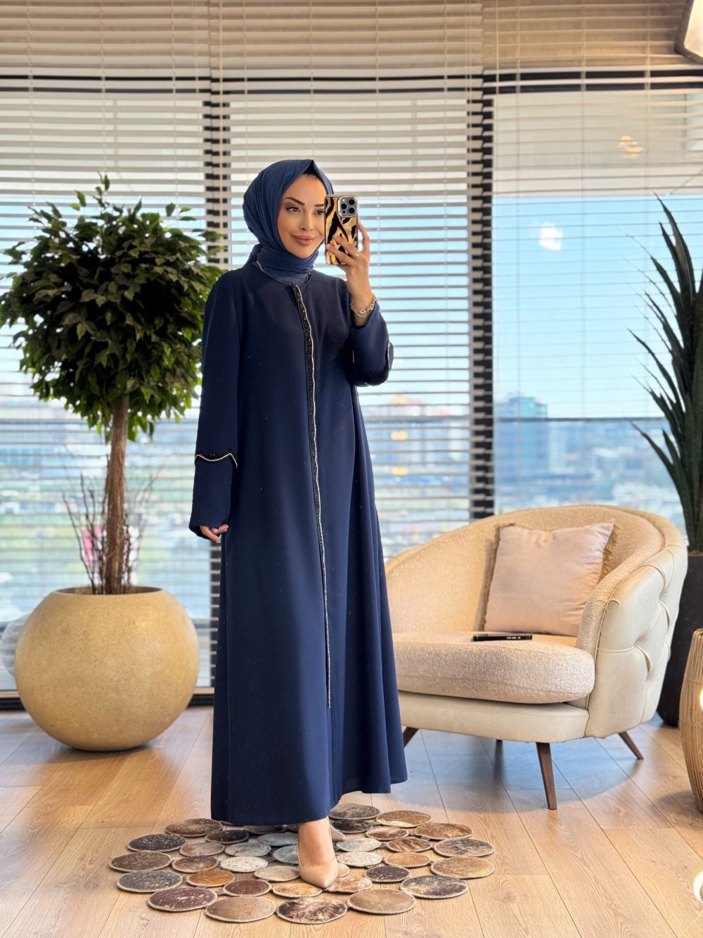 2613 Çift Kollu Taşlı Pardesü İndigo