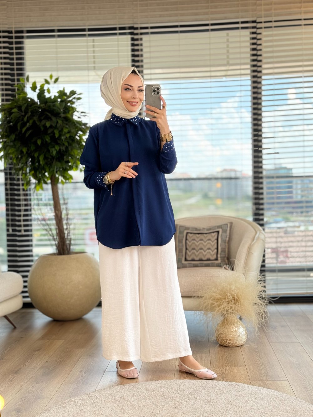 2630 Manşeti Ve Yakası Taşlı Gömlek Lacivert