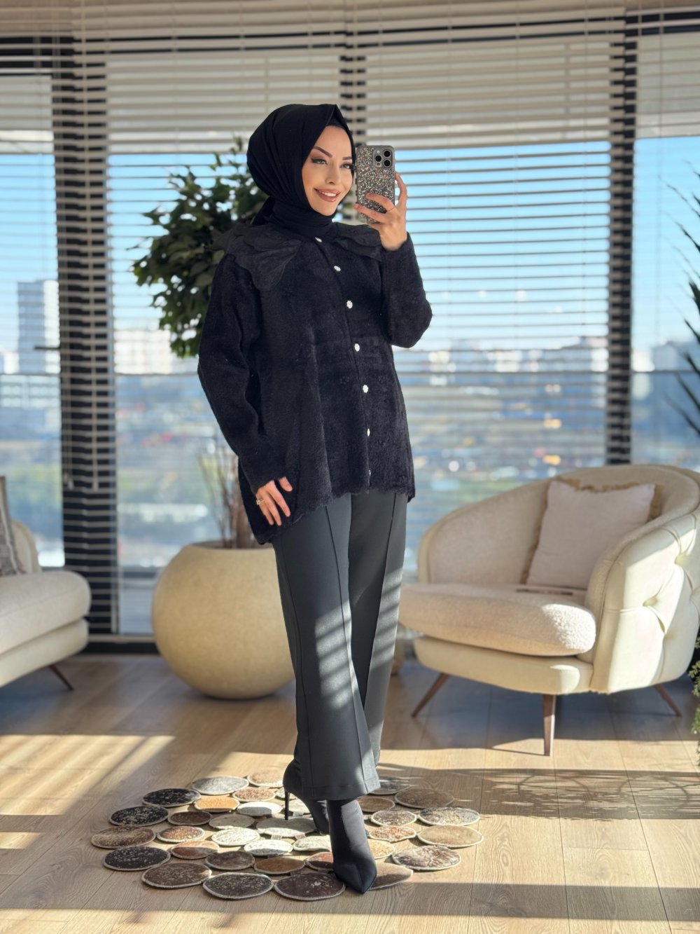 2637 Angora Dantel Yaka Uzun Hırka Siyah
