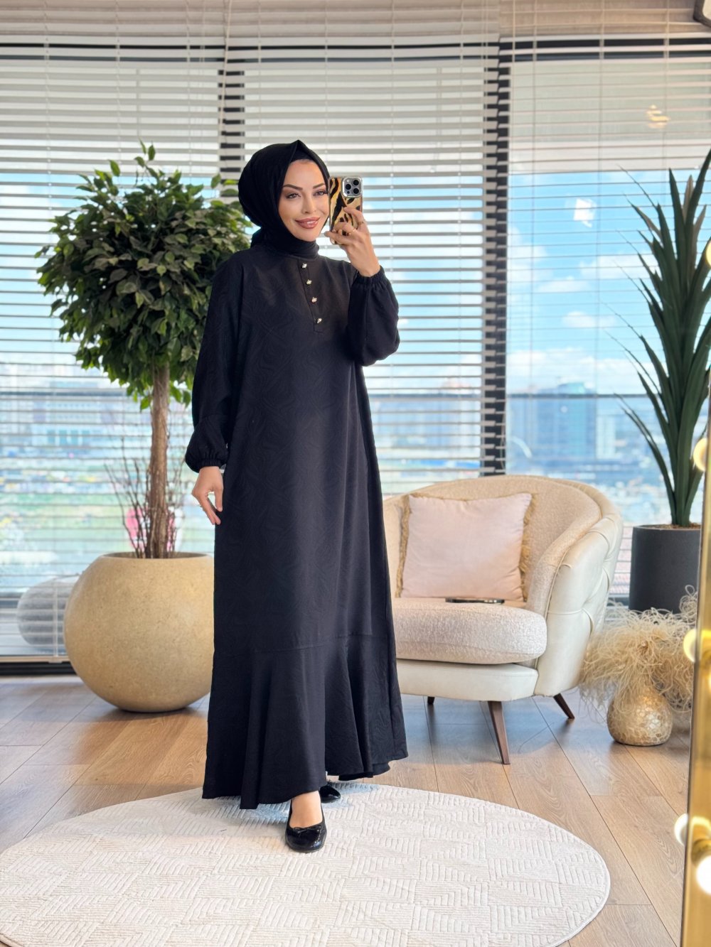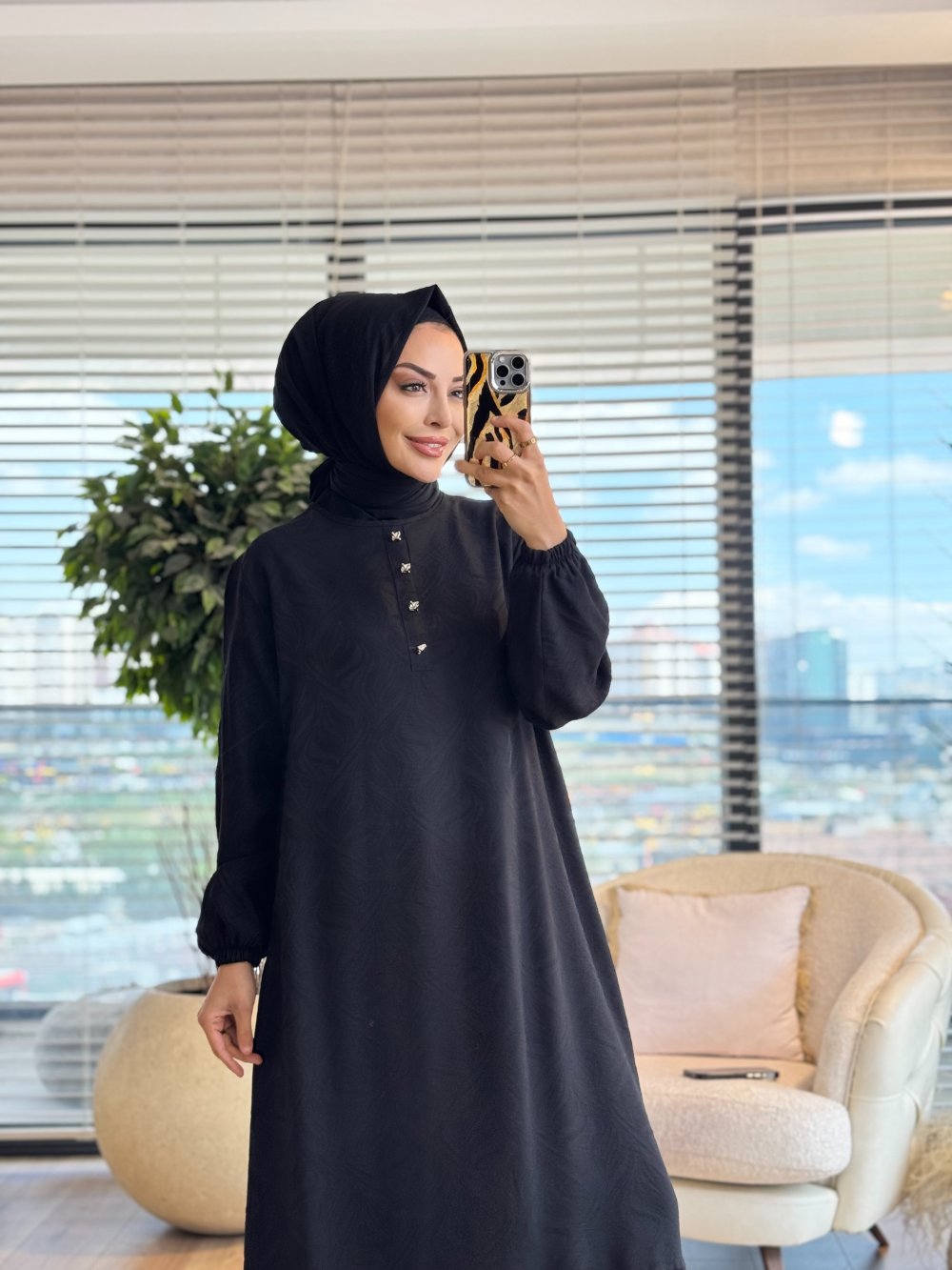 26847 Kendinden Desenli Elbise Siyah