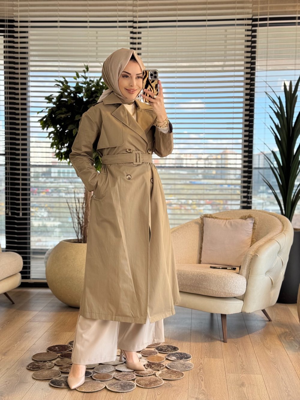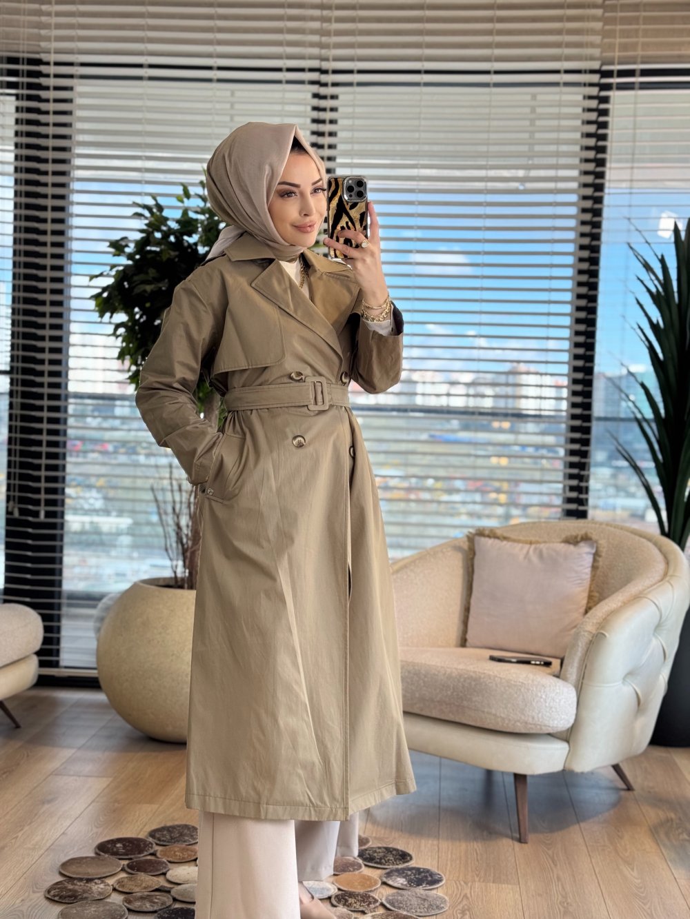 26YT706 Dört Düğme Kemerli Trenç Haki