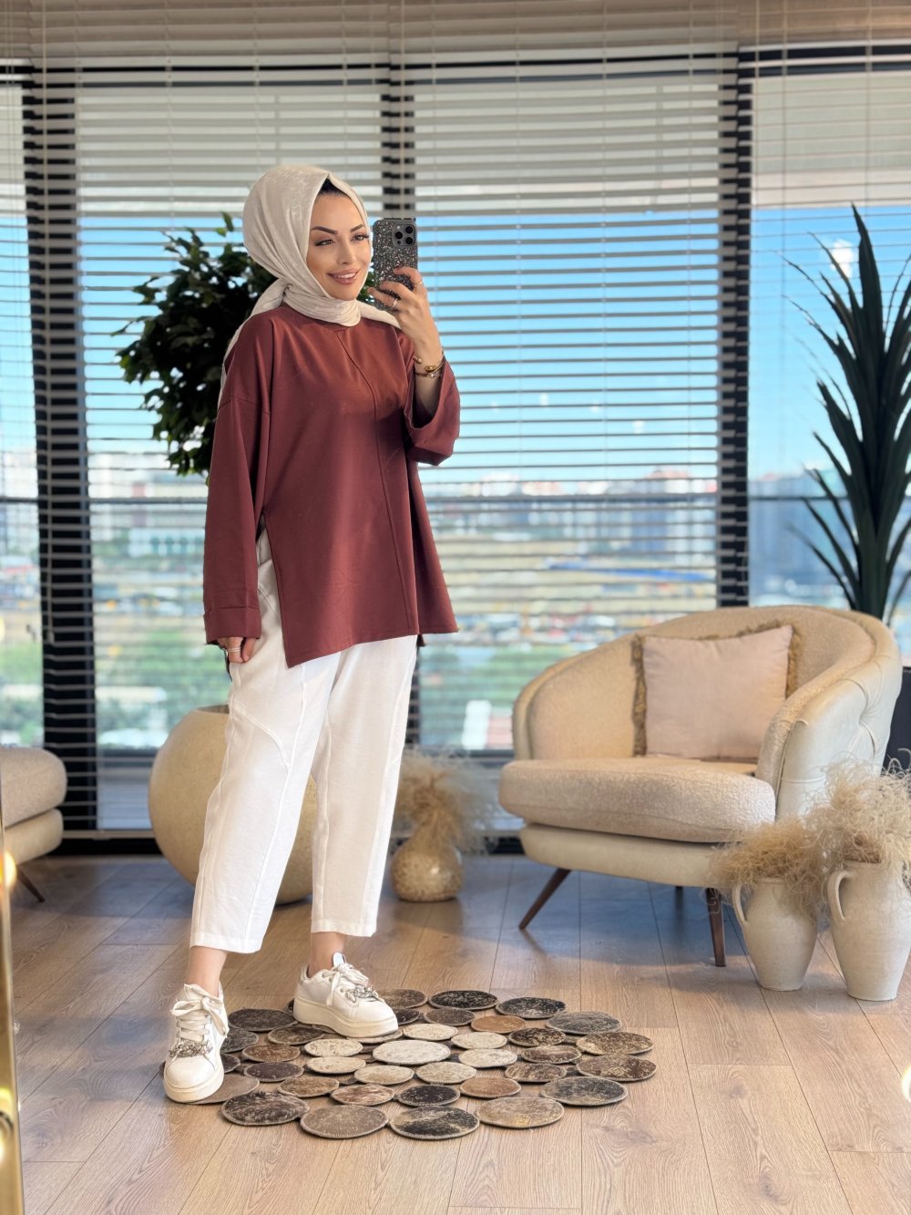 2755 Dikiş Detaylı Yırtmaçlı Sweat Kahve