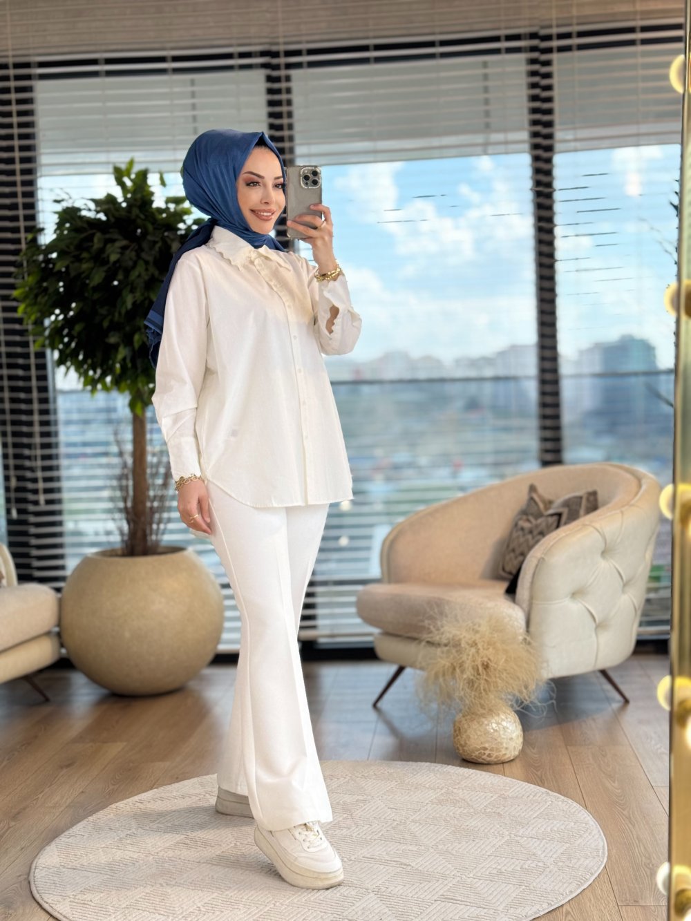 2806 Yaka Ve Manşeti Nakışlı Gömlek Ekru