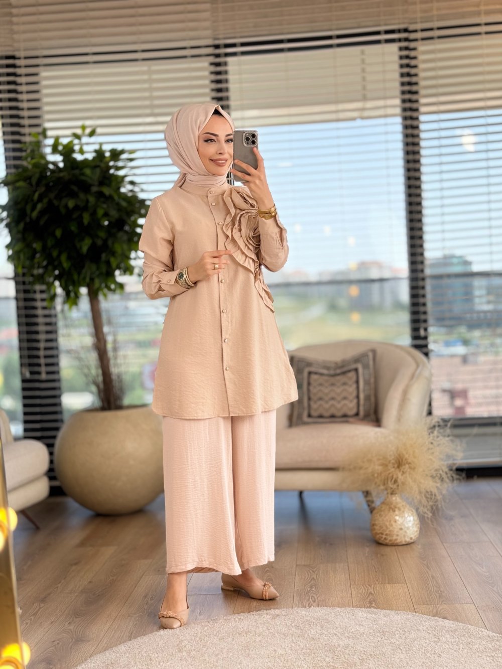 2972 Sağ Omuz Büyük Çiçekli Gömlek Bej