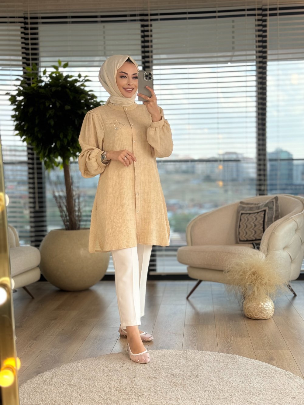2995 Gofre Sol Göğsü Taş İşlemeli Tunik Bej