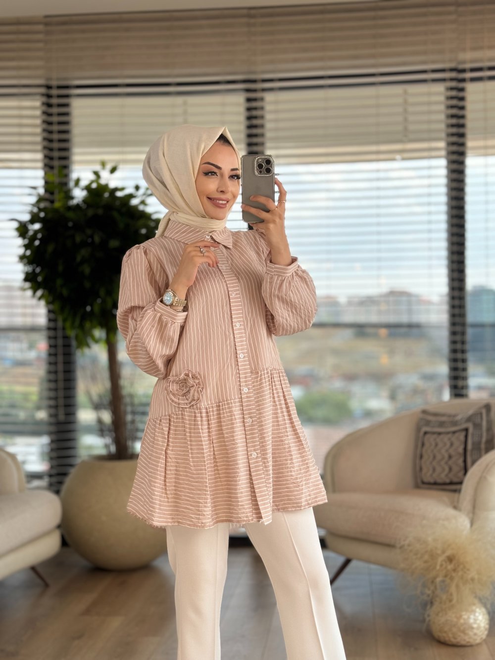 2999 Çizgili Çiçek Detaylı Tunik Kahve