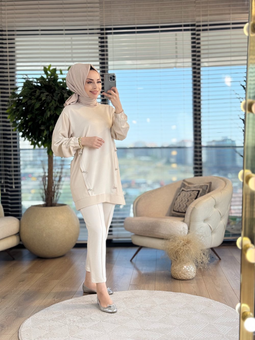 32523 Palmiye Ve Güneş Baskılı Takım Bej