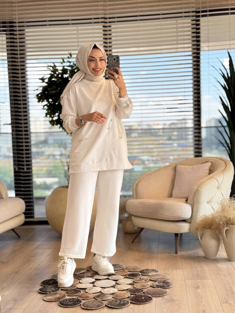 3046 Asimetrik Taş Detaylı Takım Ekru