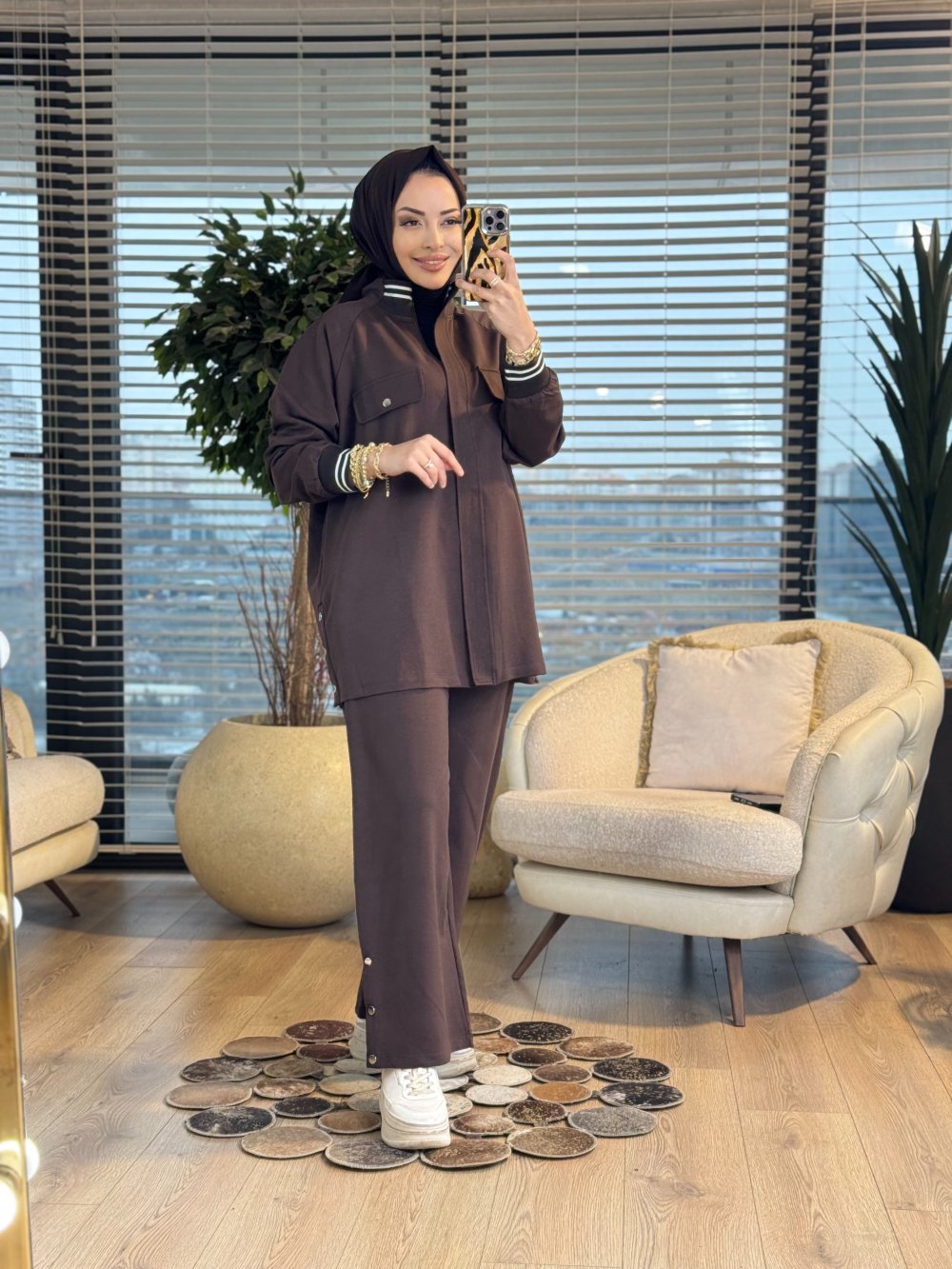 3075 Çıtçıt Ve Triko Detaylı Takım Kahve