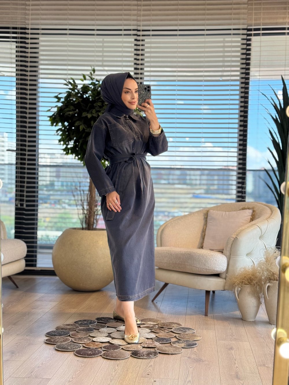 312480 Pat Fermuarlı Kot Elbise Siyah