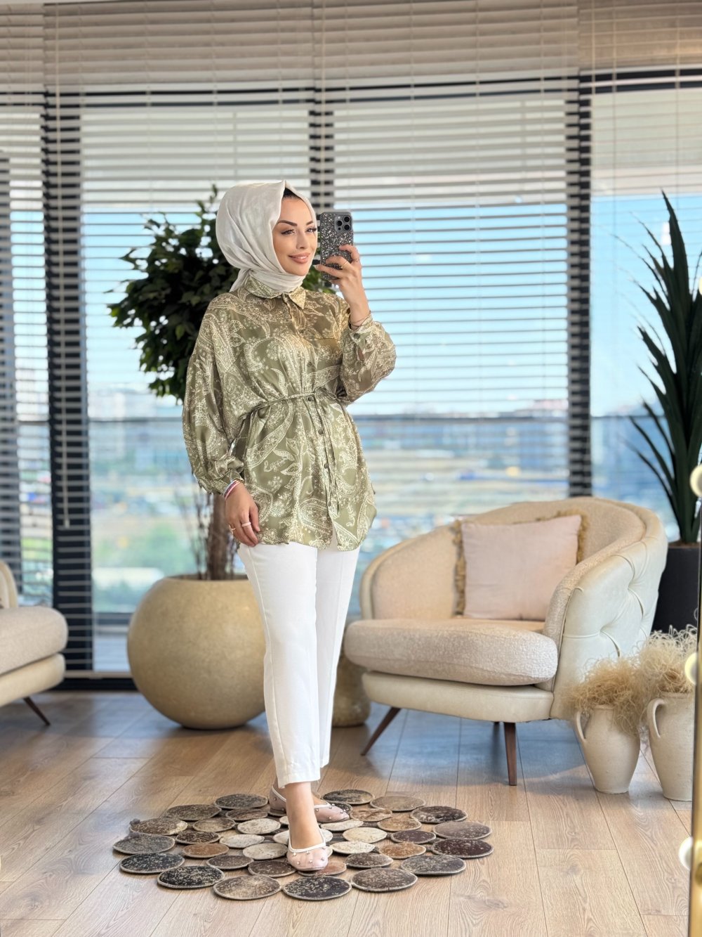 313-5 Saten Şal Desen Gömlek Çağla