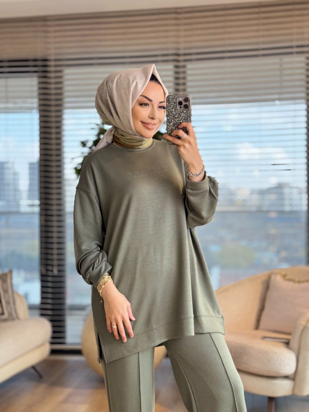 3149 Önü Baskı Detaylı Rahat Takım Haki