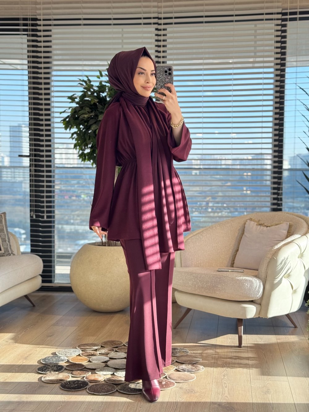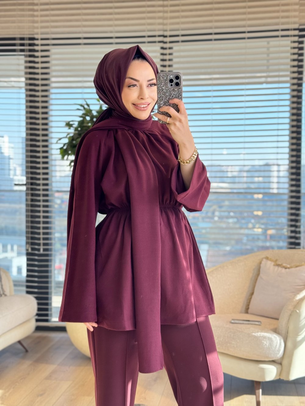 3158 Atkı Detaylı Beli Büzgülü Tunik Mürdüm