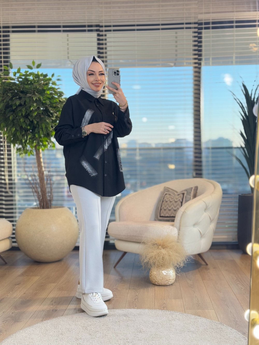 01-1290 Önü Varak Baskılı Tunik Siyah Antrasit