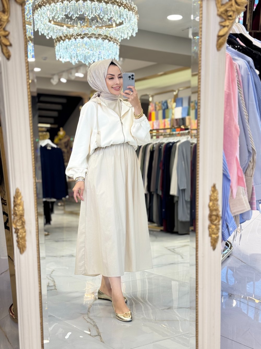 32146 Kapşonlu İkili Takım Elbise Ekru