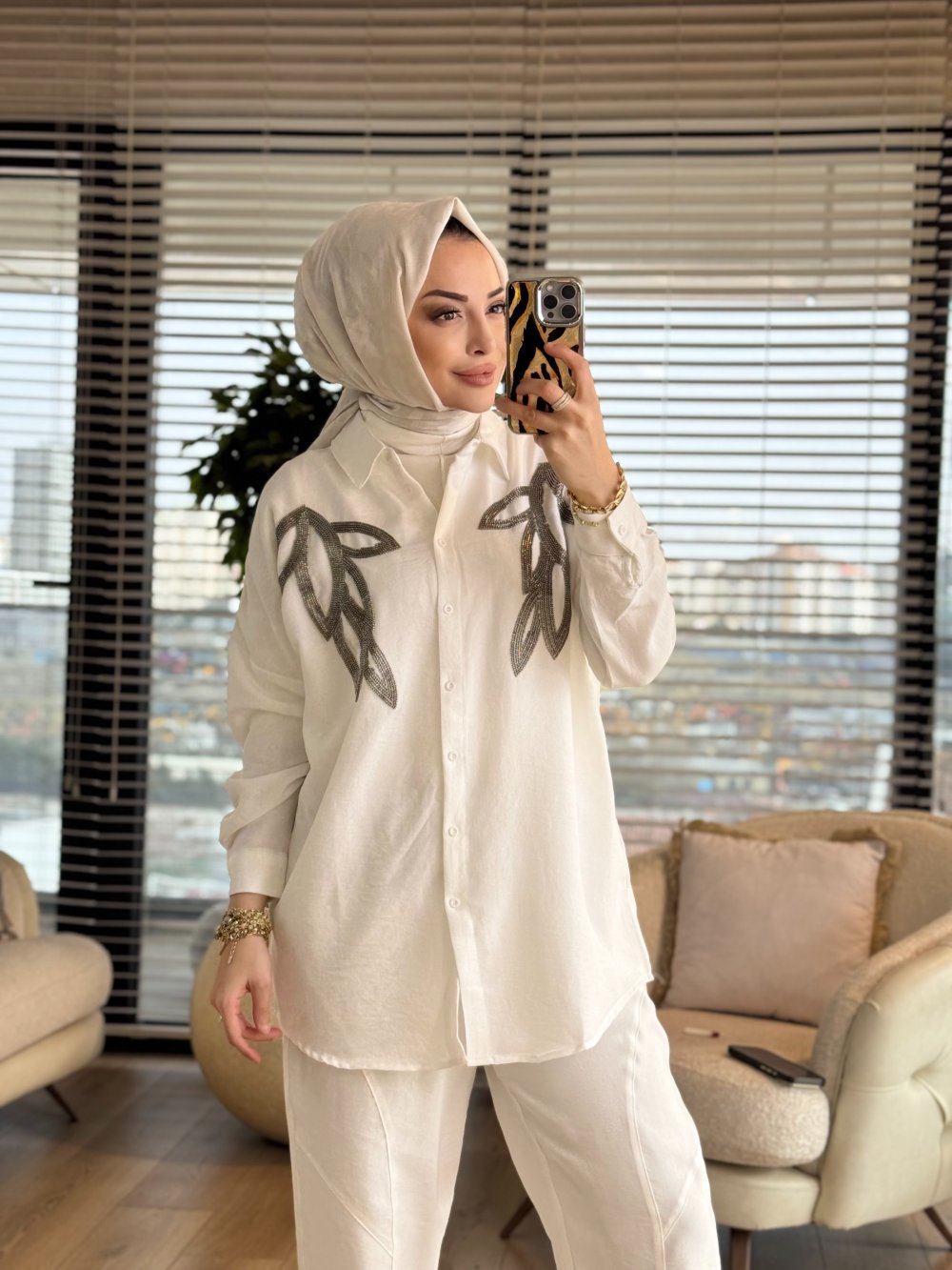 3227 Yaprak Motif İşlemeli Gömlek Ekru