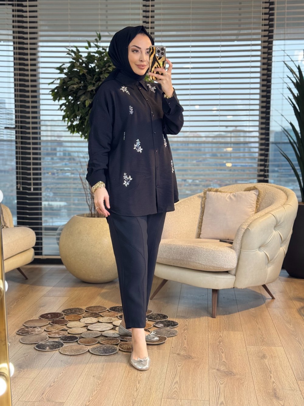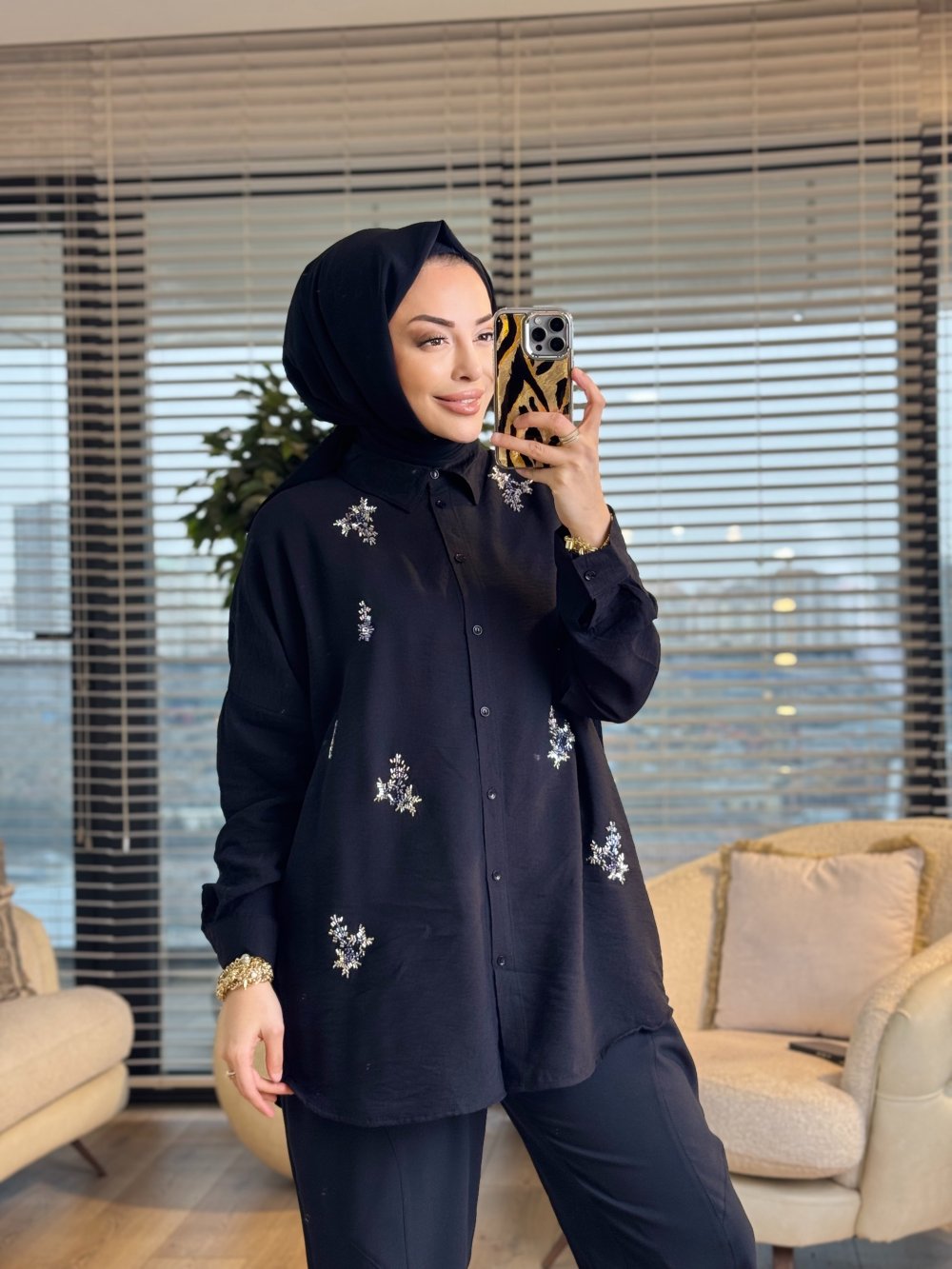 3228 Kristal Taş Detaylı Gömlek Siyah
