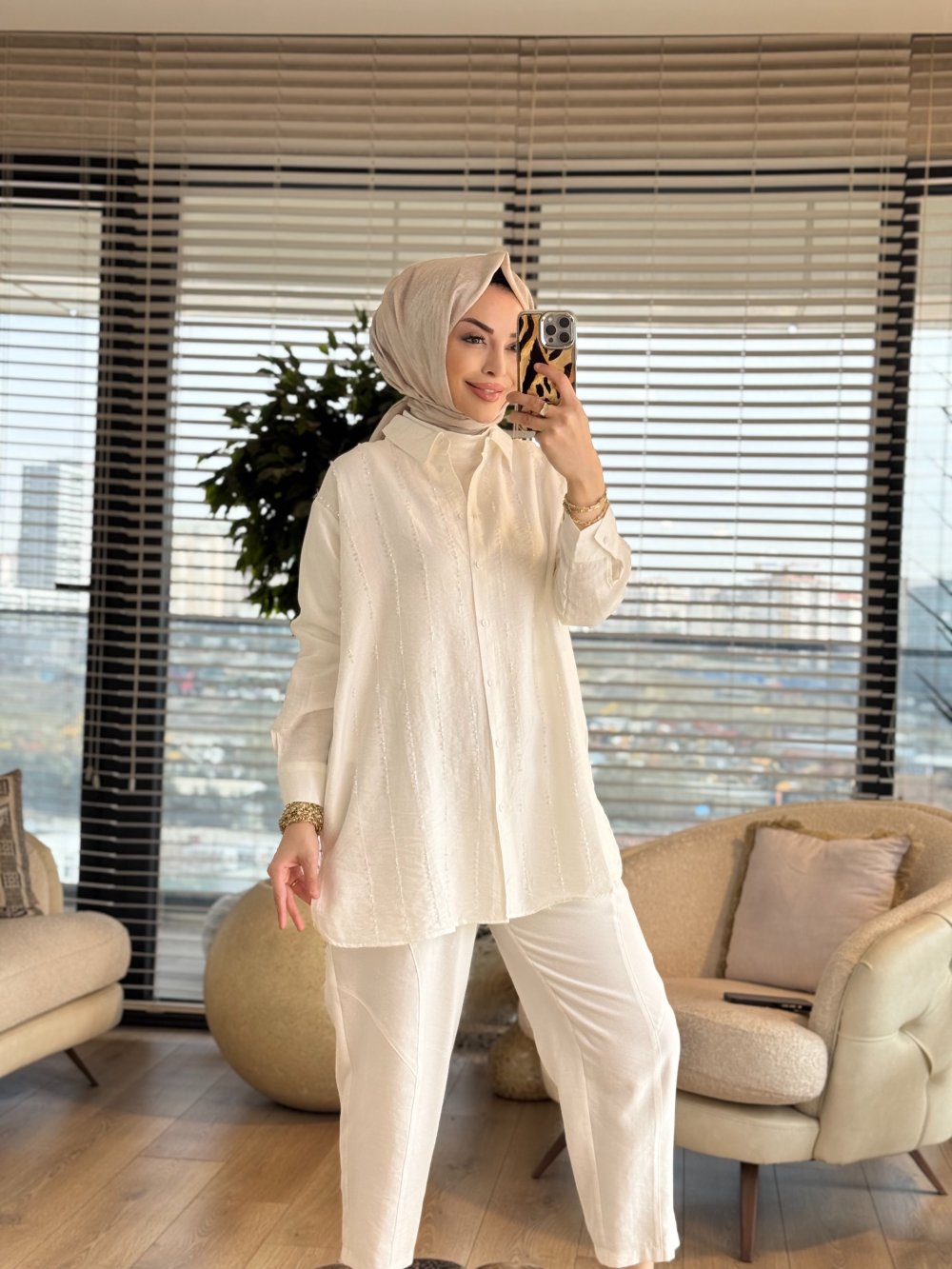 3245 Sarkıt Boncuk İşlemeli Gömlek Ekru