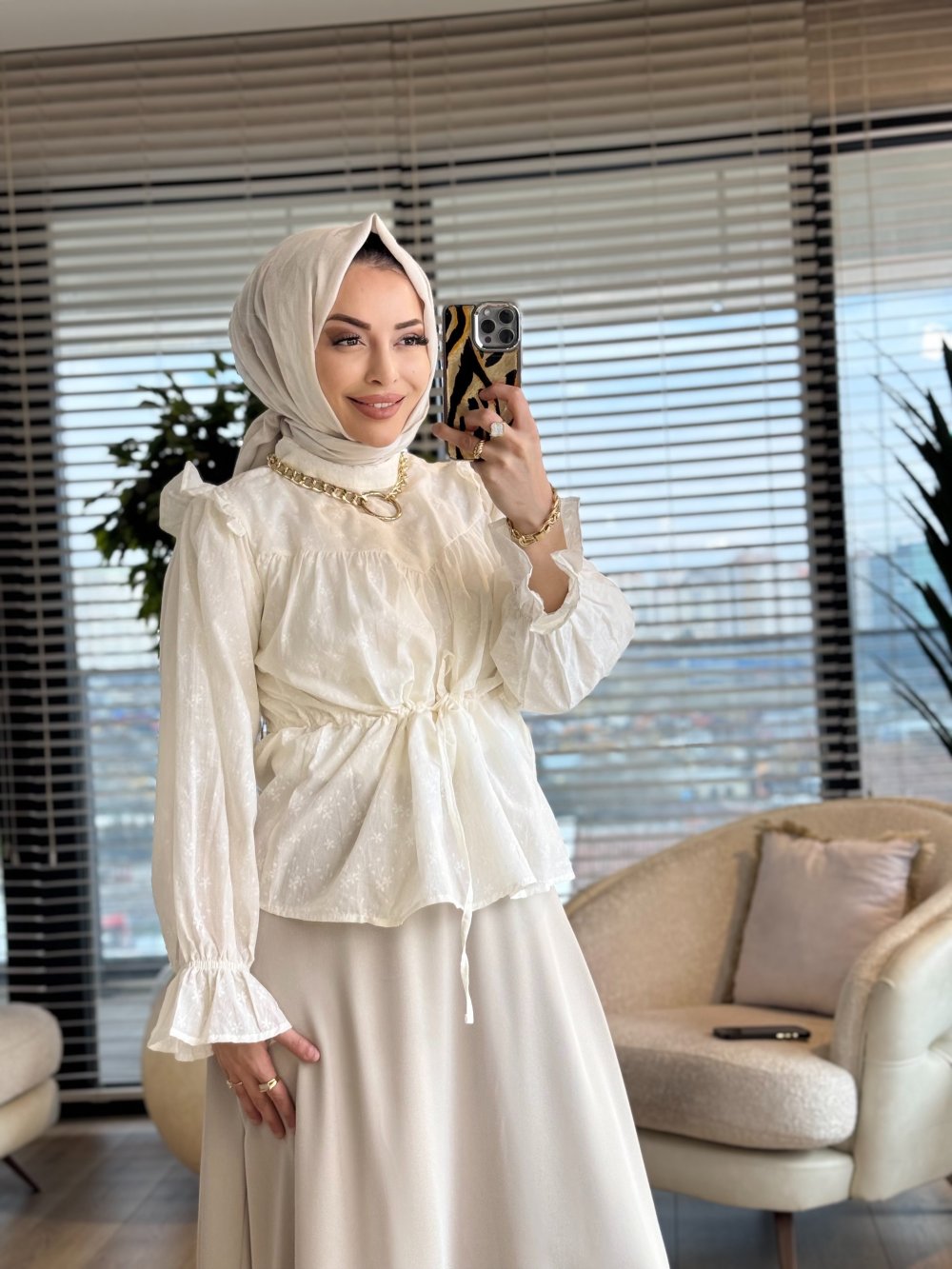 3249 Belden Bağcık Detaylı Gömlek Ekru