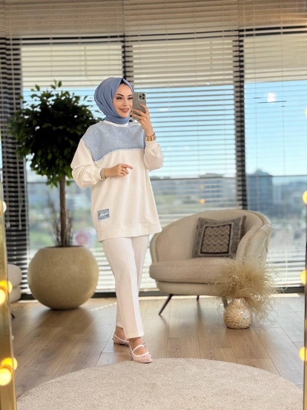 32551 Çiçek Nakış Ve Taşlı Sweat Ekru