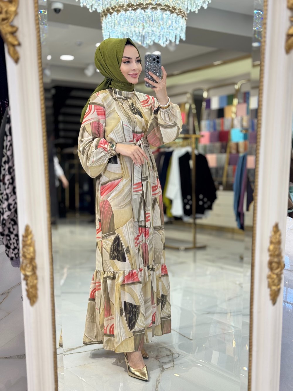 3289Y25 Keten Desenli Elbise Yağ Yeşili