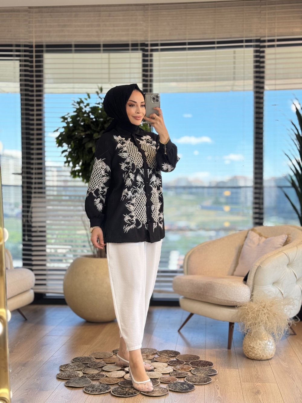 33371 Ön Kol Hasır Nakışlı Gömlek Siyah