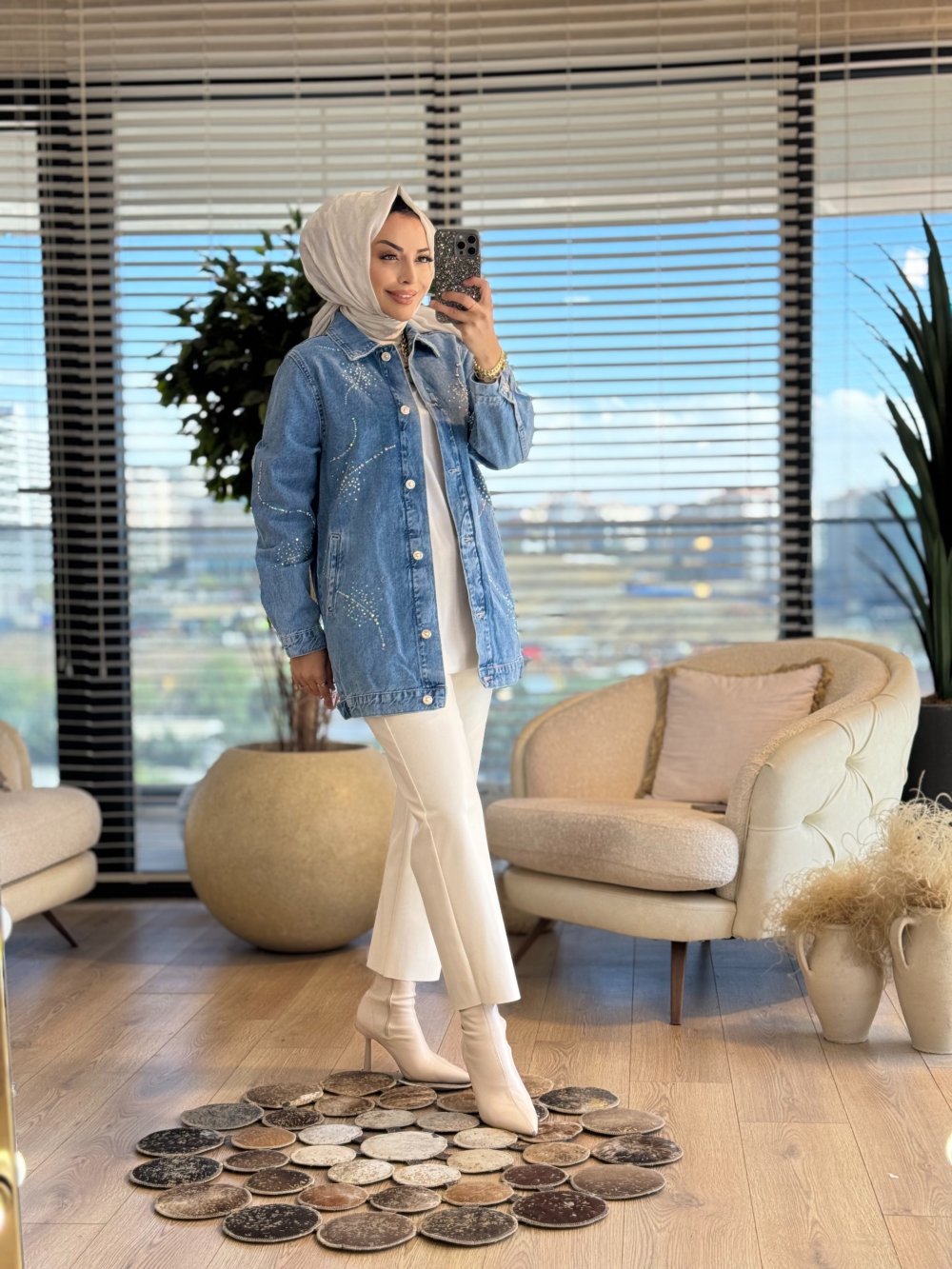 33850 Üstü Taş Baskılı Kot Ceket Mavi
