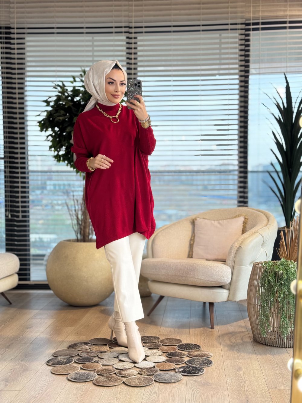 3399 Yarasa Kol Triko Tunik Kırmızı