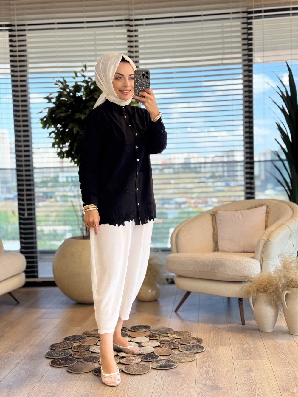 34313 Önü Kabartma Kuş Nakışlı Gömlek Siyah