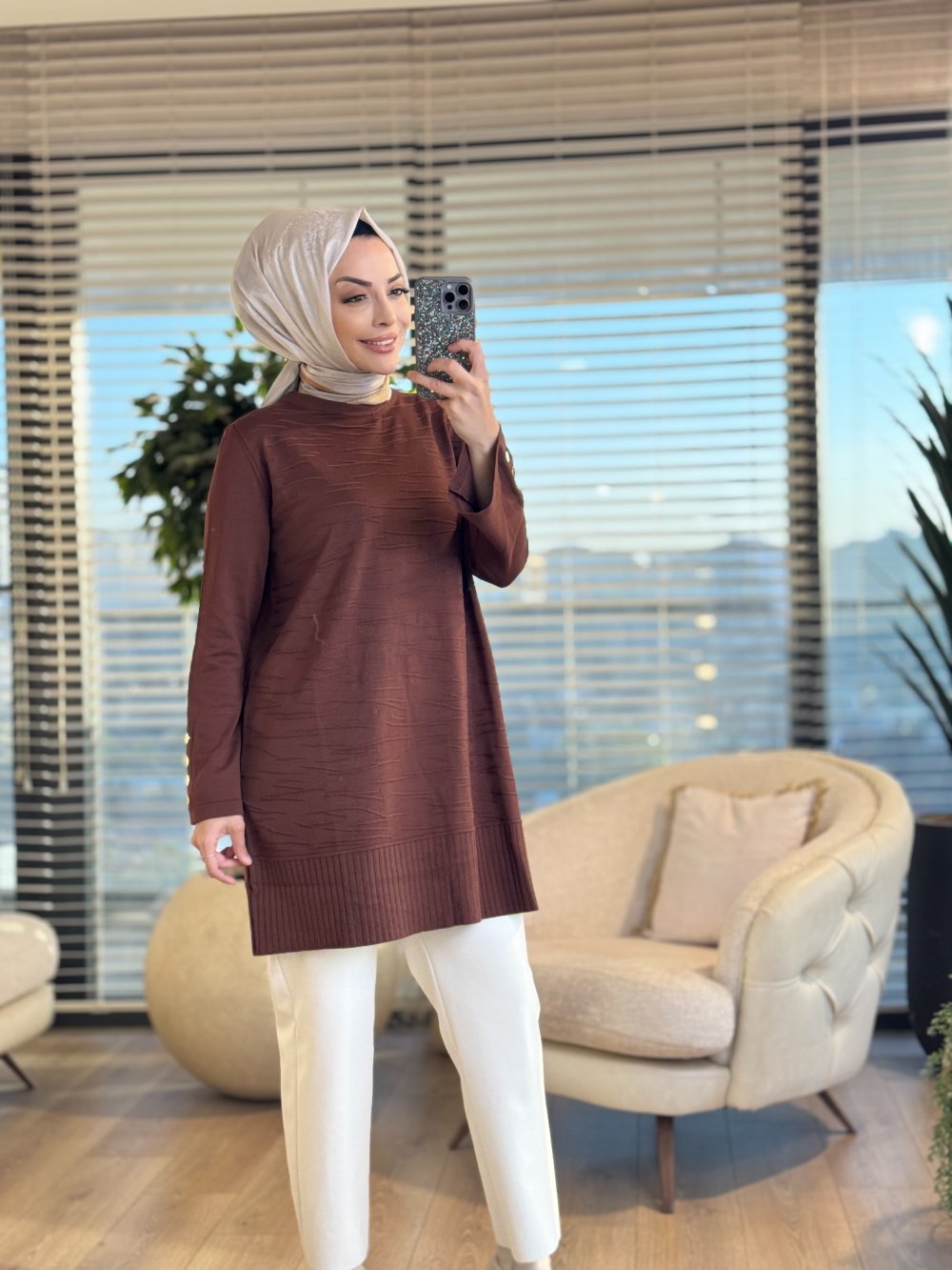 3503 Ön Kabartma Desenli Triko Tunik Kahve