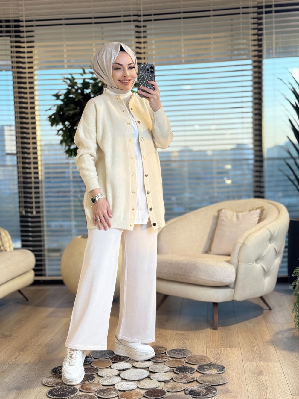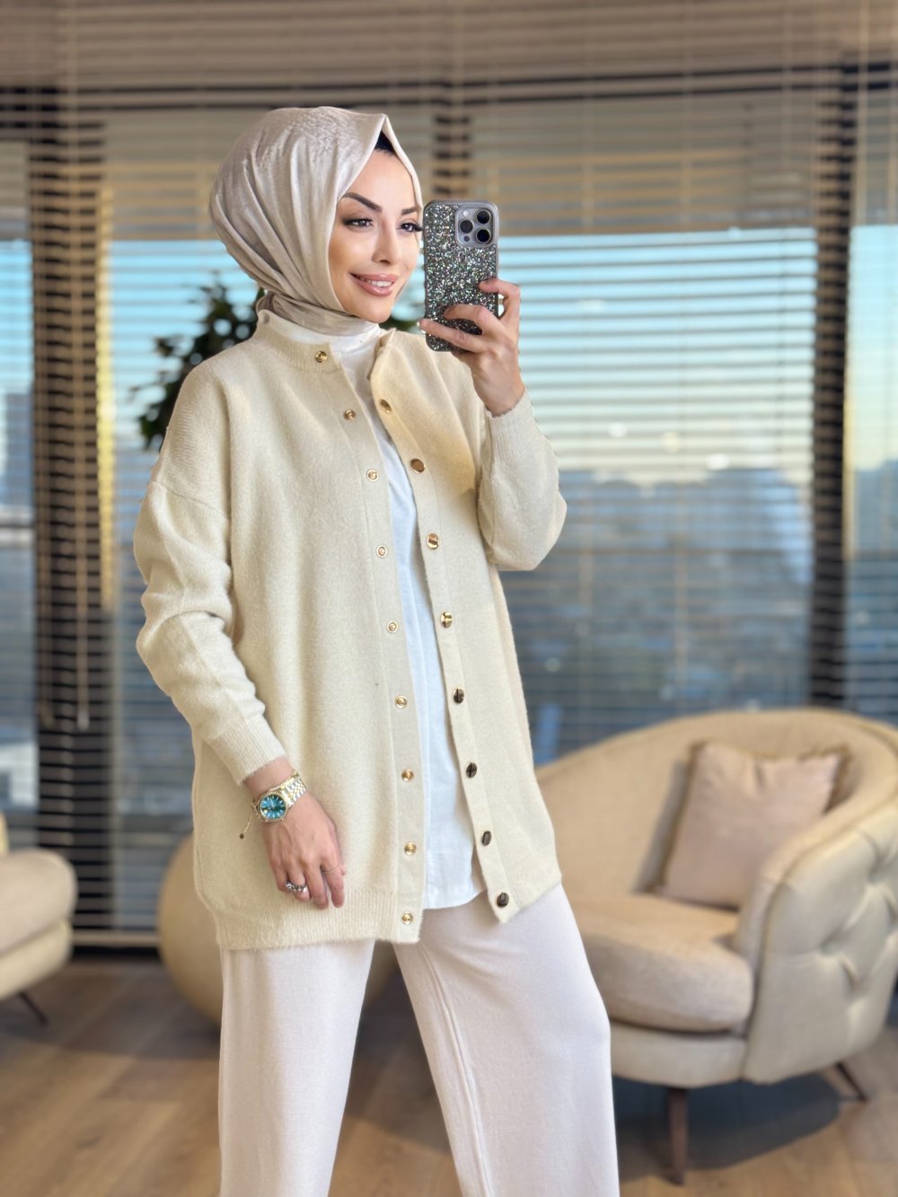 3539 Sakal Sıfır Yaka Çıtçıtlı Hırka Bej
