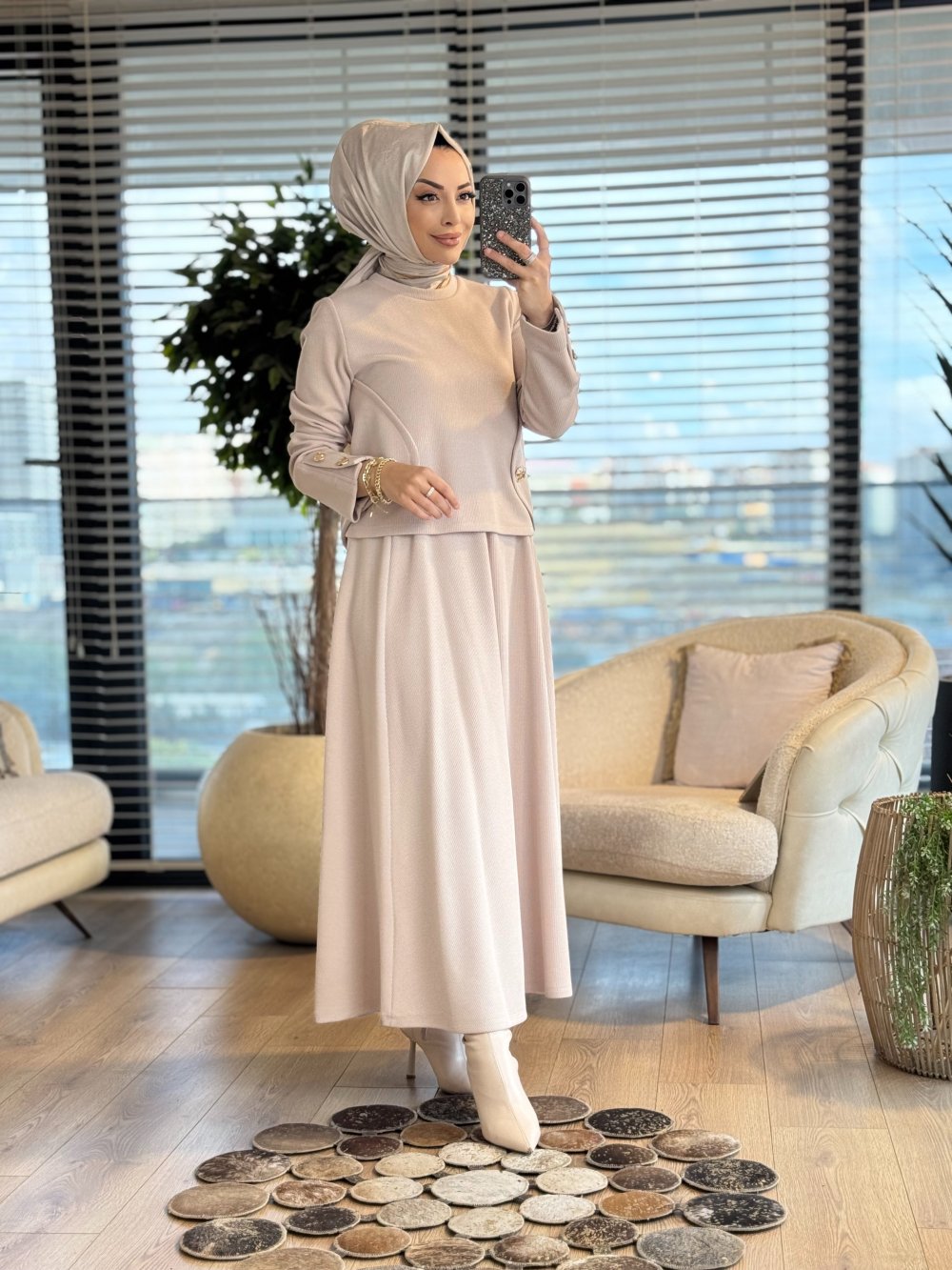 35588 Yanları Düğmeli Etekli Takım Bej