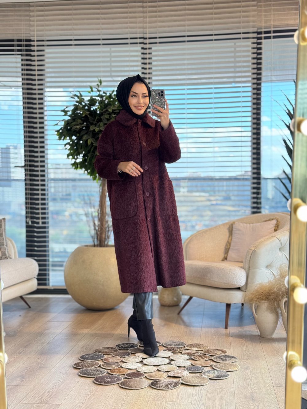 35859 Peluş Uzun Kaban Bordo