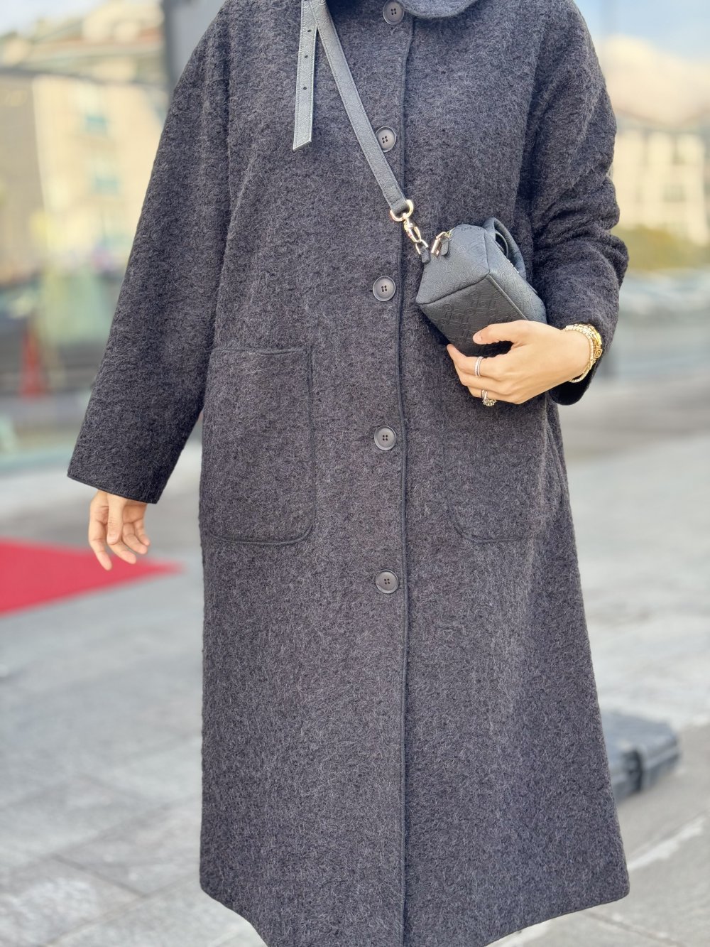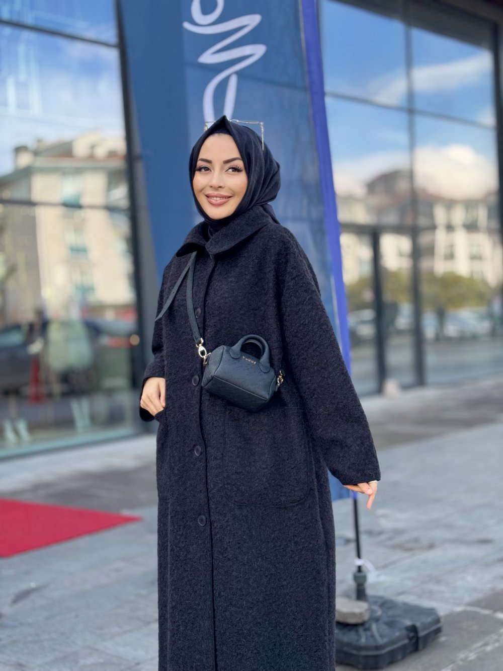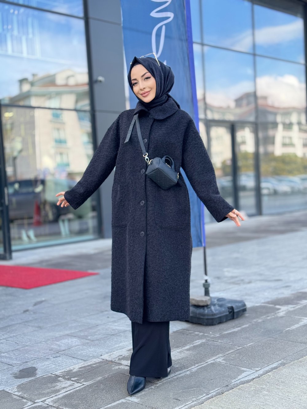 36638 Melanjlı Kaşe Bukle Kaban Siyah